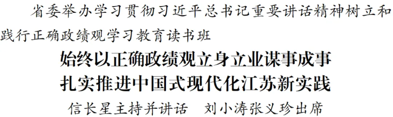 3月23日至25日,省委举办学习贯彻习近平总书记重要讲话精神、树立和践行正确政绩观学习教育读书班。省委书记信长星在开班式上讲话并主持集中交流。他强调,要深入学习贯彻习近平总书记参加今年全国人代会江苏代表团审议时的重要讲话精神、关于树立和践行正确政绩观的重要论述,用心读原著、学原文、悟原理,深刻领悟“两个确立”的决定性意义、坚决做到“两个维护”,深刻理解把握“经济大省要在研究新情况、解决新问题上下功夫、出经验”的重大意义和实践要求,进一步增强树立和践行正确政绩观的思想自觉和行动自觉,扎扎实实做好“十五五”开局之年各项工作,推动中国式现代化江苏新实践不断取得新进展新成效。省长刘小涛、省政协主席张义珍出席。